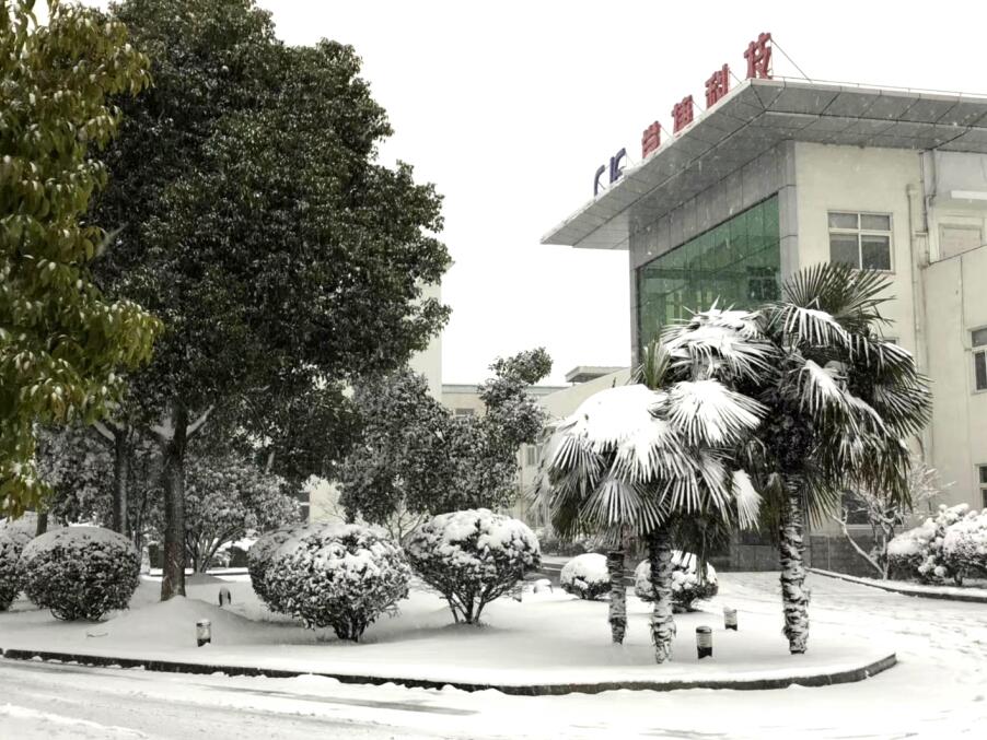 今年的雪來勢兇猛,全城開啟“冰雪奇緣”模式。廠區(qū)道路、屋面、車棚、樹木被積雪覆蓋,給全體員工的出行帶來不便。但“CJE 常捷科技”在銀裝素裹下更顯熠熠生輝。