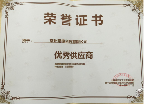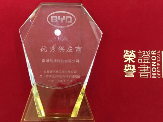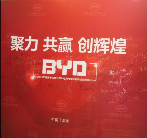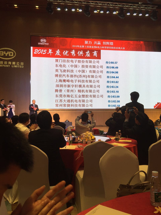 參加比亞迪汽車(BYD)第十四事業(yè)部&電力科學(xué)研究院“2015年供應(yīng)商大會(huì)”照片,并獲得“優(yōu)秀供應(yīng)商”榮譽(yù)稱號(hào)。